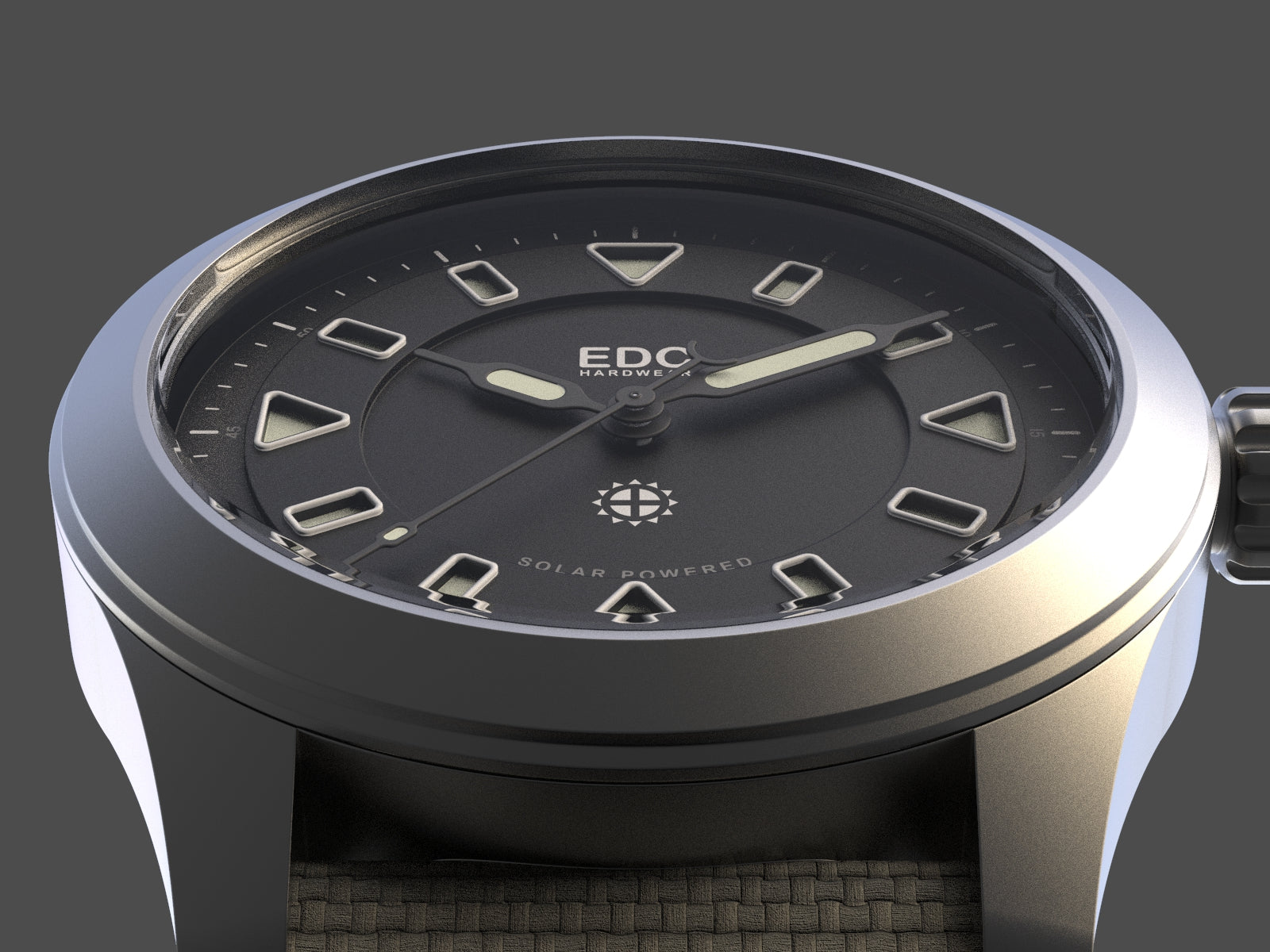 The unique diamond cut hands are custom designed to flow well with the smooth curves and corners of the dial. Length is carefully calculated to match with the dial layers. As a little easter egg, the tail of the seconds hand lines up exactly inside the EDC emblem when at 12:00. The Hour and minute hands are filled with X1 grade C3 GL (green glow) Super-Luminova while the seconds hand is filled with X1 grade C3 BL (blue glow) Super-Luminova.